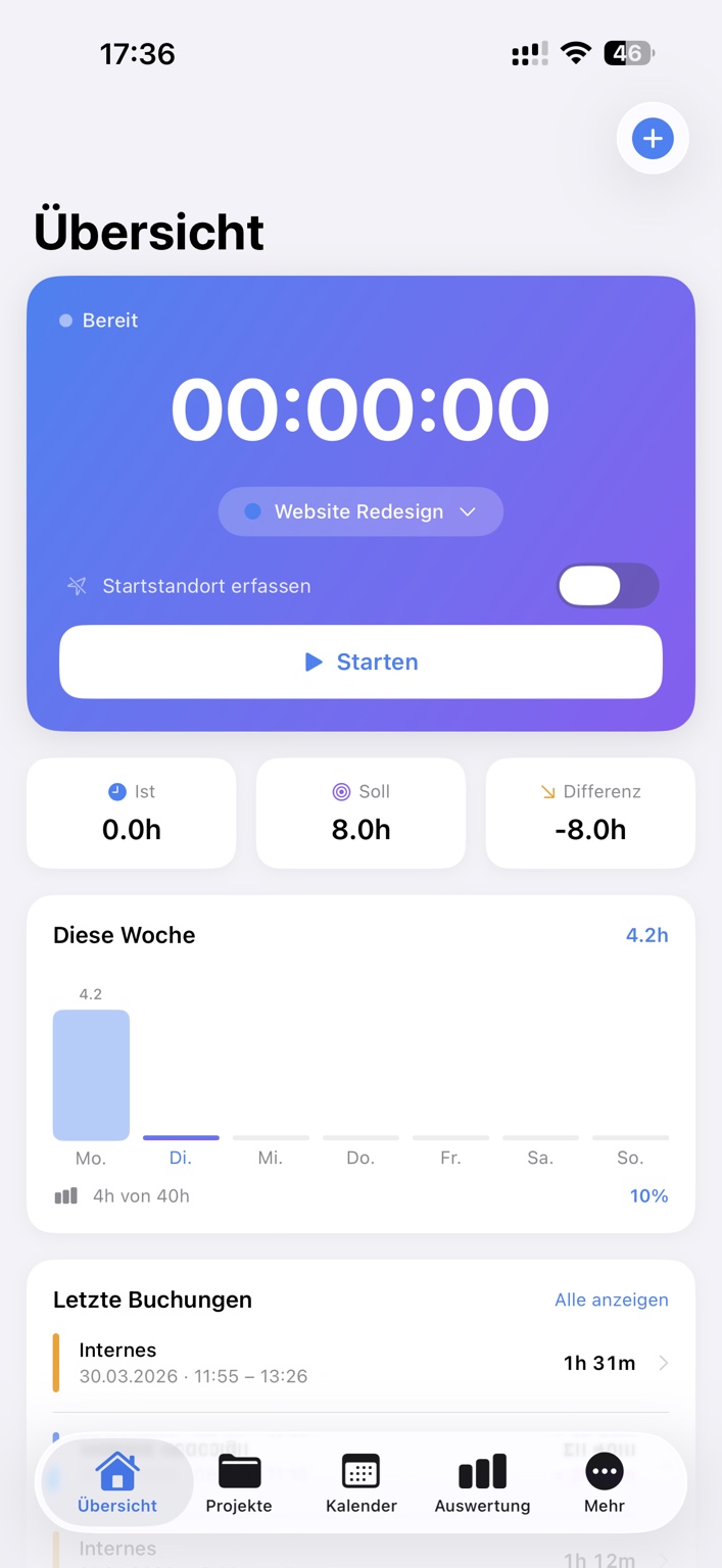 StartseiteStoppuhr, Projektwahl, Wochenfortschritt und letzte Buchungen.