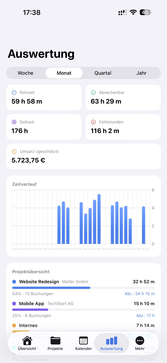AuswertungWoche, Monat, Quartal und Jahr mit Kennzahlen und Projektverteilung.